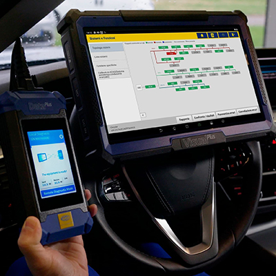 Data Plus ist ein sehr komplettes und fortschrittliches Instrument, das mit einem 3,97-Zoll-Single-Touch-Display ausgestattet ist und verschiedene Diagnoseanforderungen abdecken kann. Es ist über Wi-Fi mit Visual Plus verbunden und ermöglicht eine Mehrmarken-Diagnose, die auf eine der umfangreichsten Datenbanken auf dem Markt zurückgreift, die etwa 150 europäische, asiatische und amerikanische Hersteller umfasst. Es kann zudem Online- Codierungen für sehr anspruchsvolle Operationen durchführen und geführte Diagnoseverfahren aktivieren.